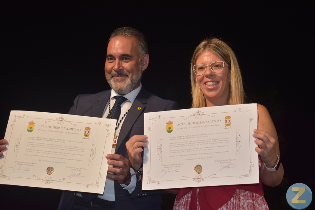 Este es el contenido del acta que, en un intenso e inolvidable 27 de agosto de feria, firmaron los primeros ediles deTomelloso e Ibi para sellar un hermanamiento que inició su andadura con un impresionante desfile de moros y cristianos y un elegante acto institucional que tuvo lugar en la plaza del Barrio del Carmen. Presentado por la periodista, Elena Jiménez Calero, el acto contó con una amplia presencia de concejales de los Equipos de Gobierno de las dos ciudades; la soberbia actuación del guitarrista, Óscar Herrero y varios cientos de ciudadanos que no quisieron perderse el histórico momento. Separadas por trescientos kilómetros las dos ciudades, gobernadas por Ayuntamiento de distinto signo político, se unen en un hermoso viaje común.