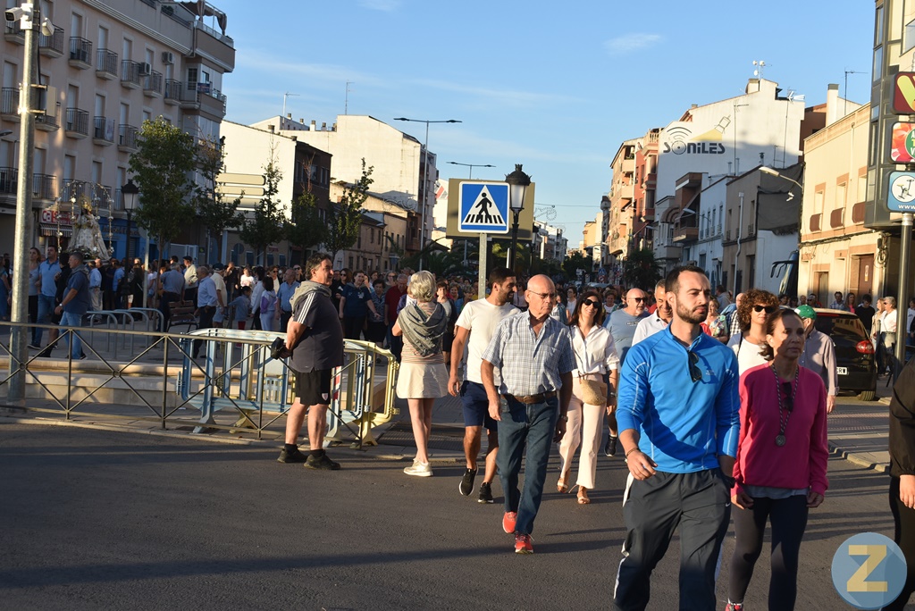 Nada más salir, en el cruce de calle Socuéllamos con Juan José Rodrigo, la imagen de la Patrona se ha girado para despedir a Encarna Ramírez, benefactora de la Virgen, que saludaba emocionada desde la ventana de su casa. El camino ha seguido por la calle Socuéllamos y la avenida Virgen de las Viñas con muchos vecinos despidiendo a la Patrona desde las puertas y balcones. Los vivas a la Virgen y su niñete, pronunciados con fervor y mucho sentimiento, han sido frecuentes durante todo el recorrido.
