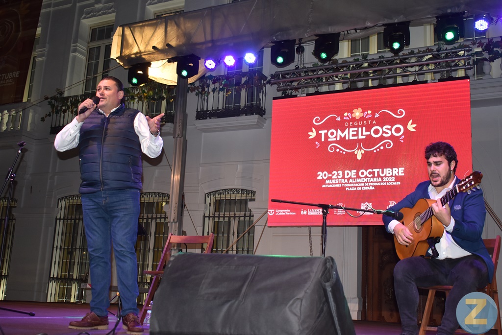 La muestra agroalimentaria "Degusta Tomelloso" tuvo otra gran aliciente en la noche del viernes: la actuación de Chemi El Choileja que volvió a estar acompañado por ese gran guitarrista que es Adrián Lomas y esos incondicionales que nunca le fallan. El Choileja llenó de buen arte la plaza de España en una noche fresca, pero agradable que invitaba a disfrutar con la actuación de este tomellosero que, curiosamente, trabaja en el sector de la alimentación.