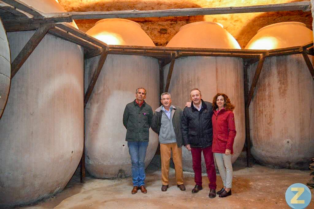 Bajamos por una ancha escalera que los propietarios reformaron porque se encontraba en mal estado. Por esa escalera se bajaron las tinajas de barro y también por una de las tres lumbreras como delata su forma circular y el relleno que se hacía después. Pisando suelo, admiramos una cueva en forma de herradura, reforzada con un pilar y un muro que coincide con la línea de la fachada y que va en consonancia con la estética de la construcción. Alberga 18 tinajas: 11 son de barro de cuatrocientas arrobas de capacidad y 7 de cemento de 500 arrobas. Nuestro experto tinajero, José María Díaz, que nos acompaña, no tardará en reconocer la mano de su padre en las tinajas de cemento que se construyeron en torno al año 1930.