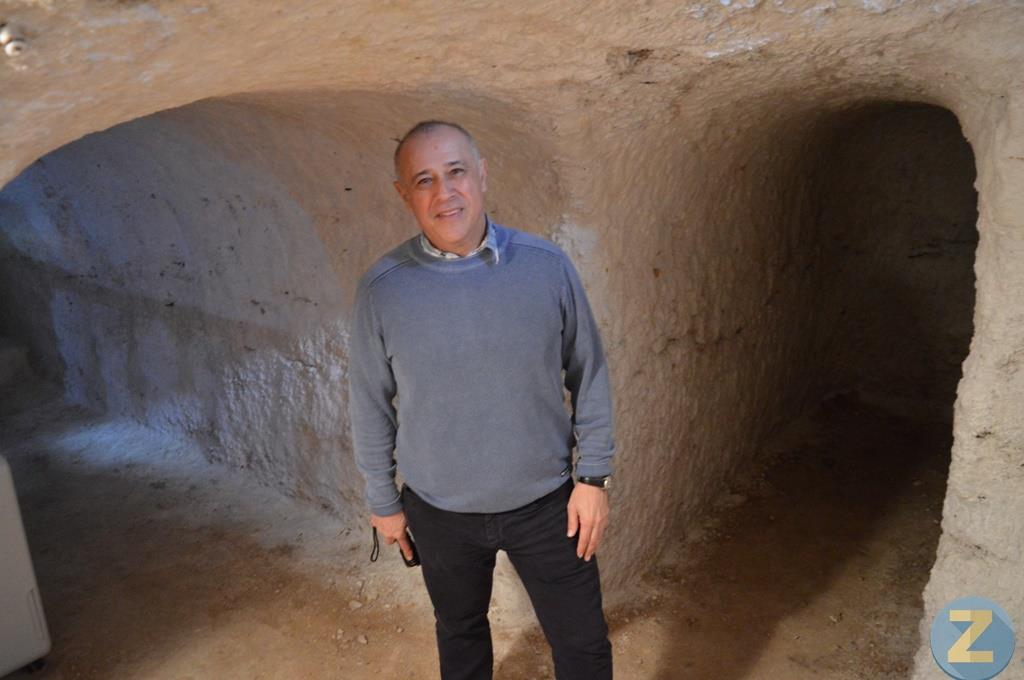 Accedemos por una contramina de unos ocho metros de longitud, uno de esos pasadizos que nos hacen imaginar el juego que darían estas cuevas para rodar historias de Harry Potter o cualquier otra serie fantástica. El propietario va alumbrando con su linterna los rincones de una cueva que tiene varias tinajas de barro, algunas de ellas rotas, de unas 250 arrobas. “Arreglándola esta cueva también puede quedar muy chula”, dice el propietario que tiene en mente ceder el solar a su hijo. “Cuando lo tenga que haga él lo que quiera”.