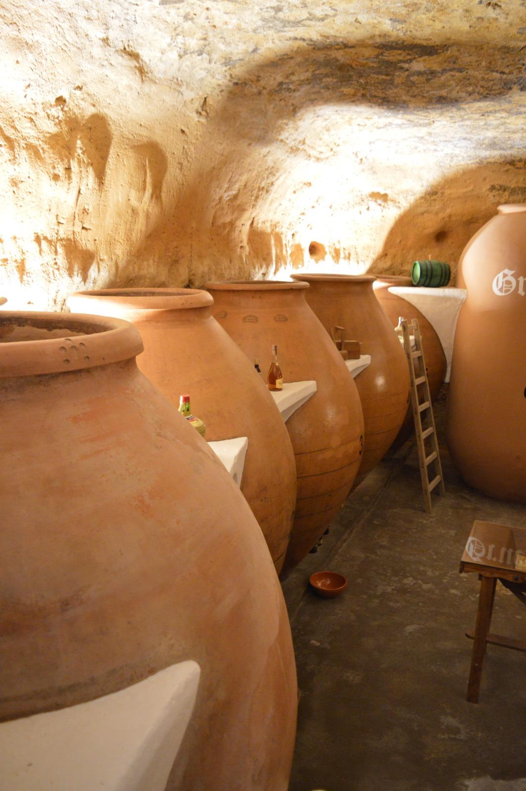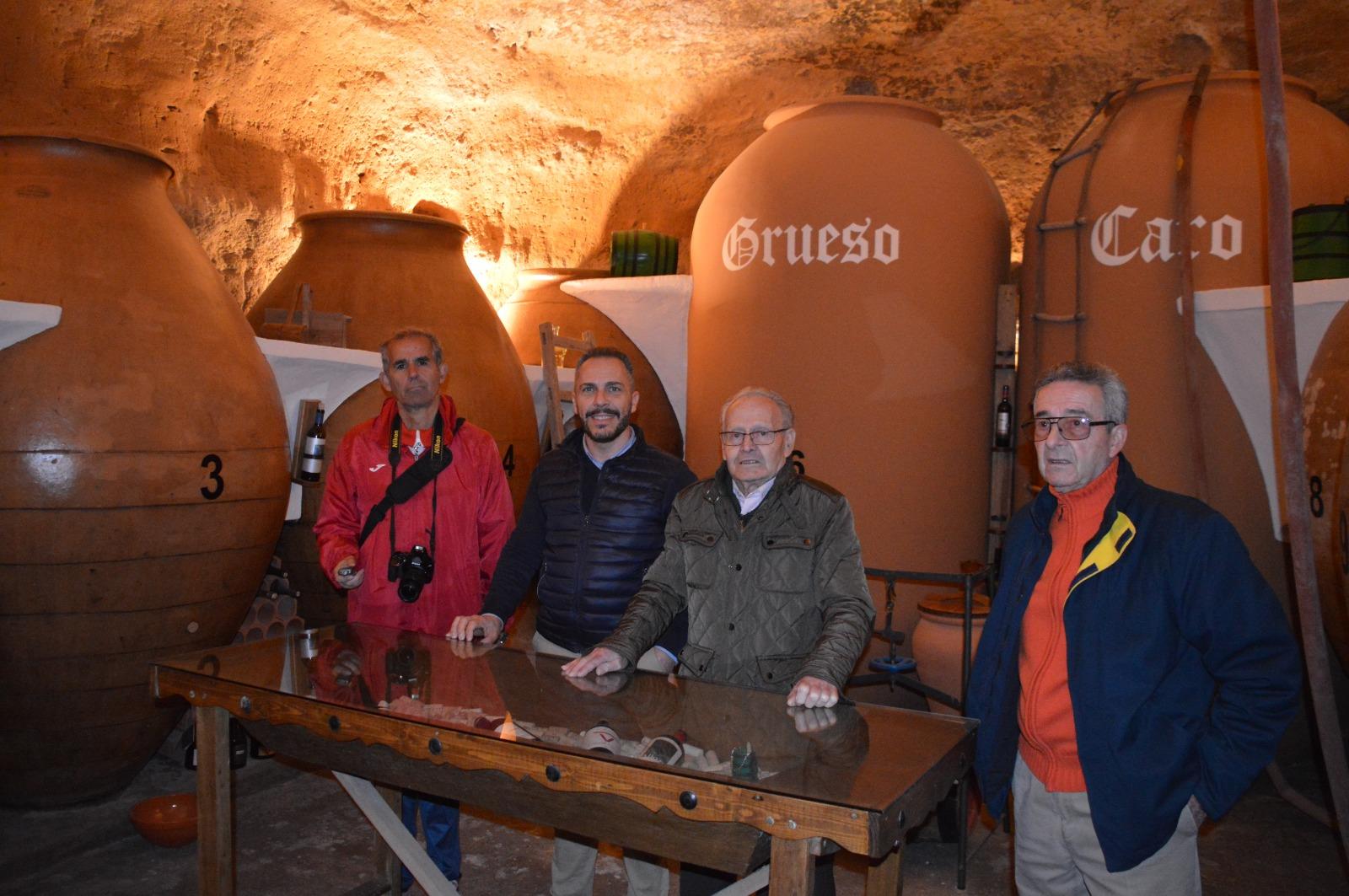 Bajamos por la escalera y nos topamos con la foto del abuelo José Villena y otros curiosos aperos restaurados a la perfección y algunas bonitas miniaturas, como una que reproduce un arado de timón. La cueva da cobijo a once tinajas, nueve de barro, de unas 240 arrobas de capacidad y dos de cemento de unas 400 arrobas que se hicieron cuando se fracturaron algunas de las de barro. Éstas se fabricaban en Villarrobledo, como demuestra el sello que aparece en algunas de ellas. En las tinajas de cemento aparecen estampados los apellidos del matrimonio propietario: Grueso Caro.