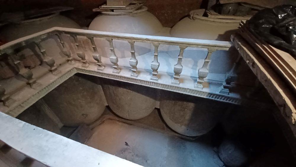 Las tinajas fueron construidas por José María Díaz Benito alrededor del año 1930. La cueva cuenta con una lumbrera de desgarre trapezoidal y el techo se encuentra en la pura tosca. “Estamos en una de las zonas de la ciudad que más grosor de tosca tiene”, precisa José María. El balaustre, está en perfecto estado y observamos también una original moldura dentro del empotre de la cueva. Las tinajas están separadas con unos rabos estriados.