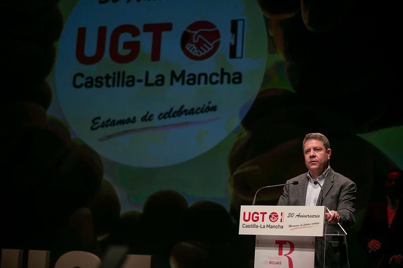 El presidente de Castilla-La Mancha, Emiliano García-Page, ha rubricado 25 pactos, y acuerdos, con la patronal regional y con los sindicatos de clase desde que es jefe del Ejecutivo castellanomanchego. Así lo ha destacado hoy en su intervención en el marco del 30 aniversario de la UGT de Castilla-La Mancha, cuya conmemoración ha tenido lugar en el Teatro de Rojas en la ciudad de Toledo.