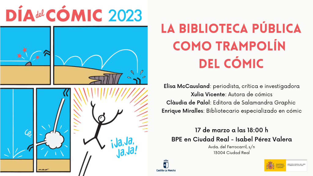 Entre las actividades organizadas, destaca la charla ‘La biblioteca como trampolín del cómic’, que tendrá lugar mañana viernes 17 de marzo de 18 a 19 horas en la BPE ‘Isabel Pérez Valera’, en la que participarán Elisa McCausland (periodista, crítica e investigadora española especializada en cultura popular y feminismo y fundadora del Colectivo de Autoras de Cómic), Xulia Vicente (ilustradora y autora de los cómics ‘Duerme Pueblo’ junto a Núria Tamarit, y ‘Ari, cazador de dragones’ con guion de Manuel Gutiérrez), Clàudia de Palol (editora de Salamandra Graphic del Grupo Penguin Random House) y Enrique Miralles (bibliotecario de la Biblioteca Pública del Estado en Valladolid especializado en cómic).
