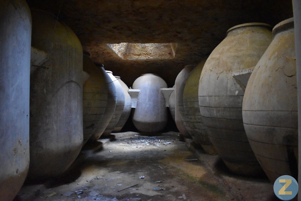 Las tinajas aparecen unidas por un empotre de cemento en buen estado. José María descubre el hueco que ocupó otra tinaja y se observa la tinajera en la que apoyaba el pico de la tinaja y ese hueco que se hacía en la pared para acomodar la panza. La mayoría de las tinajas tienen dos tapones que permitían extraer el vino de diferentes calidades y algunas de las de cemento están pintadas en tono sanguina con el fin de que no desentonara con las de barro.