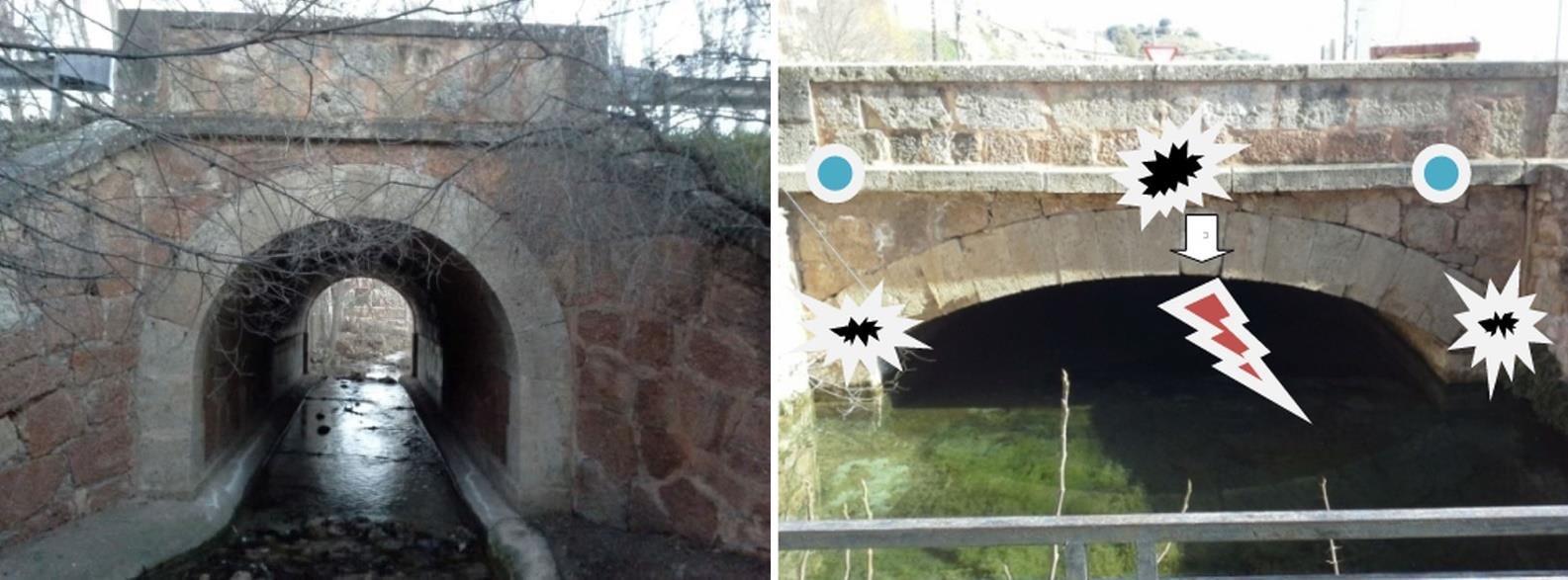 ”Puente del Caño”, con estallamientos en los sillares, por la presión que ejercen los vehículos de gran tonelaje, y arco Carpanel en la Fábrica de la Pólvora.
