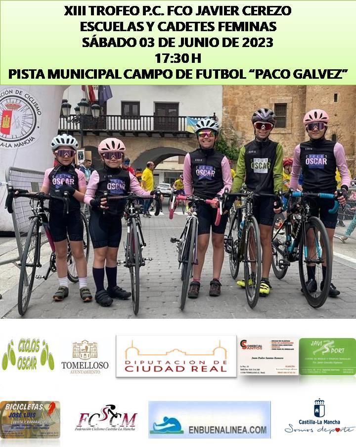 La Pista Municipal Campo de Fútbol Paco Gálvez de Tomelloso espera a los escolares del ciclismo regional el próximo sábado 3 de junio, desde las 17:30 horas, para disputar un Trofeo Escuelas Peña Ciclista Francisco Javier Cerezo que este año cumple su edición número trece.