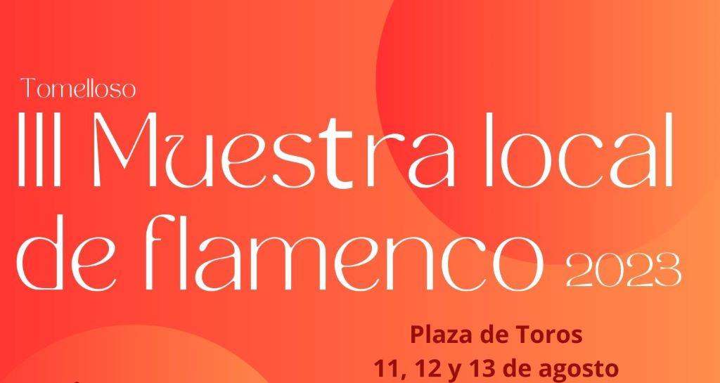 La Plaza de Toros de Tomelloso acogerá del viernes 11 de agosto al domingo 13 la III Muestra Local de Flamenco, que comenzará con las actuaciones de la Asociación Cultural “Capricho Flamenco”, la Asociación “Raíces Flamencas” y la Asociación Cultural Flamenca “Amanecer”. El sábado actuarán la Asociación Cultural Flamenca Daniel Castellanos, la Peña Flamenca “Los de Montoya y Chacón” y la Asociación Cultural Flamenca “Cantando al Alba”.