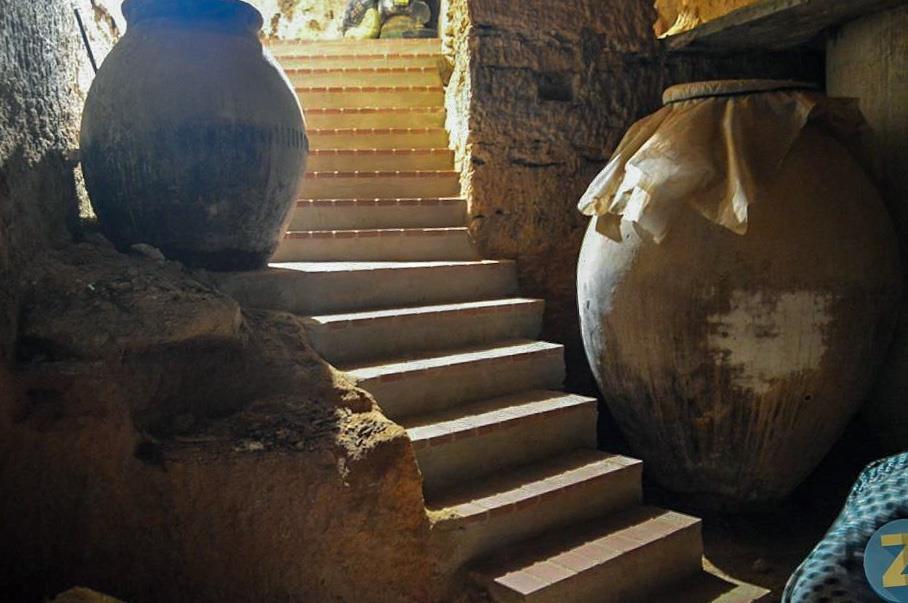 Entre las tinajas, aún se sostiene el empotre y nos llama también la atención una vieja gradilla que presenta un buen estado. Una de las paredes presenta suaves huecos, que era donde apoyaban las panzas de anteriores tinajas. El suelo está revestido de cemento e incluye la canaleta que conduce al pocillo.