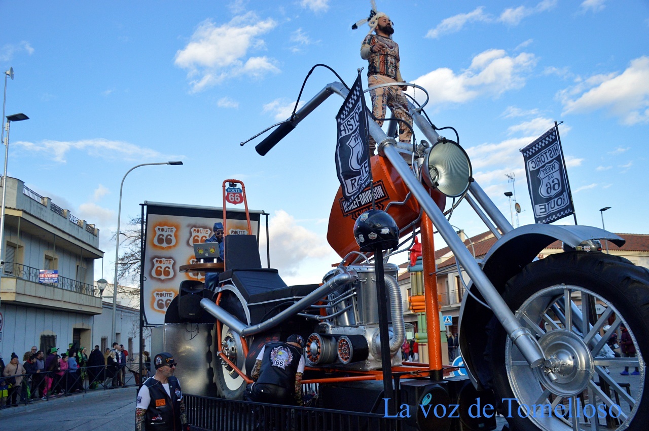 En la modalidad de carrozas, la Peña La Casualidad, de Argamasilla de Alba, ha puesto sobre el asfalto una espectacular “Ruta 66” con unos trajes muy ocurrentes que simulaban la parte delantera de una moto y una espectacular carroza portando una gigantesca Harley Dadvison. Los Amigos del Arte, de Daimiel, se han adentrado en el medievo con “La Leyenda de Juana de Arco” y no se han amilanado ante el imprevisto de una avería que les ha obligado a empujar la carroza.