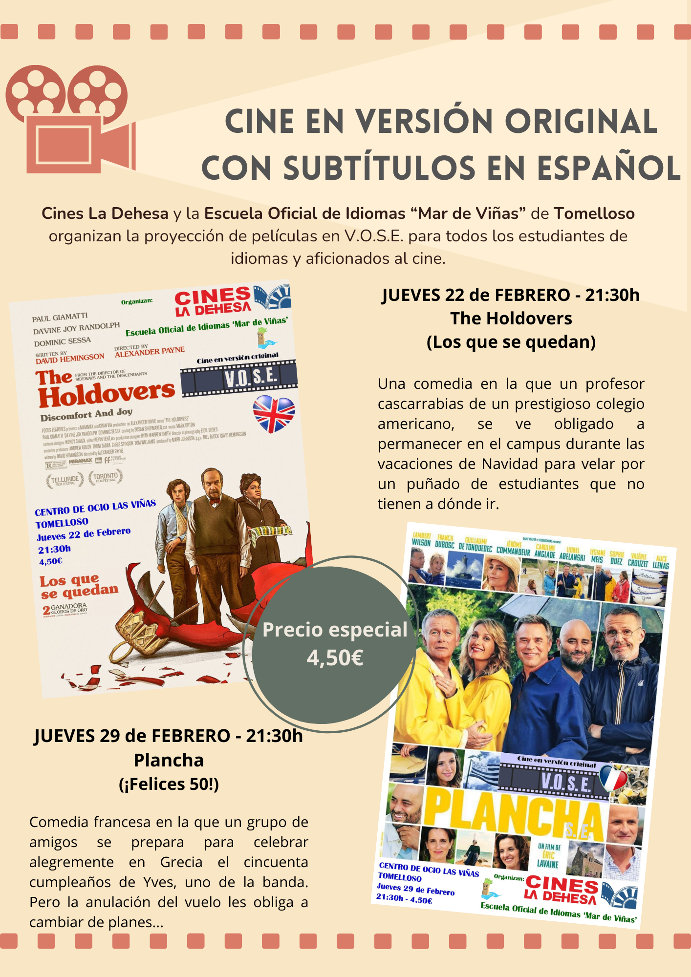 La Escuela Oficial de Idiomas "Mar de Viñas" en colaboración con los cines La Dehesa de Tomelloso ha programado la proyección de dos películas en versión original (una en inglés y otra en francés) con subtítulos en español. El día 22 de febrero se proyectará la película americana The Holdovers (Los que se quedan) y el día 29 de febrero la película francesa Plancha (¡Felices 50!). Las dos películas van en clave de comedia. El precio de las entradas será de 4,50 euros.