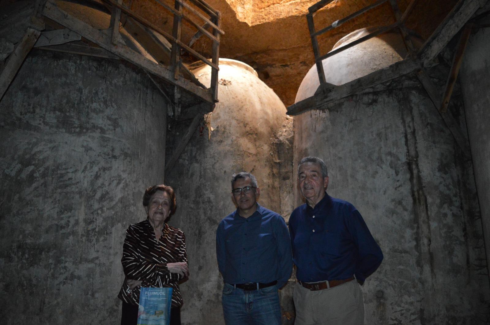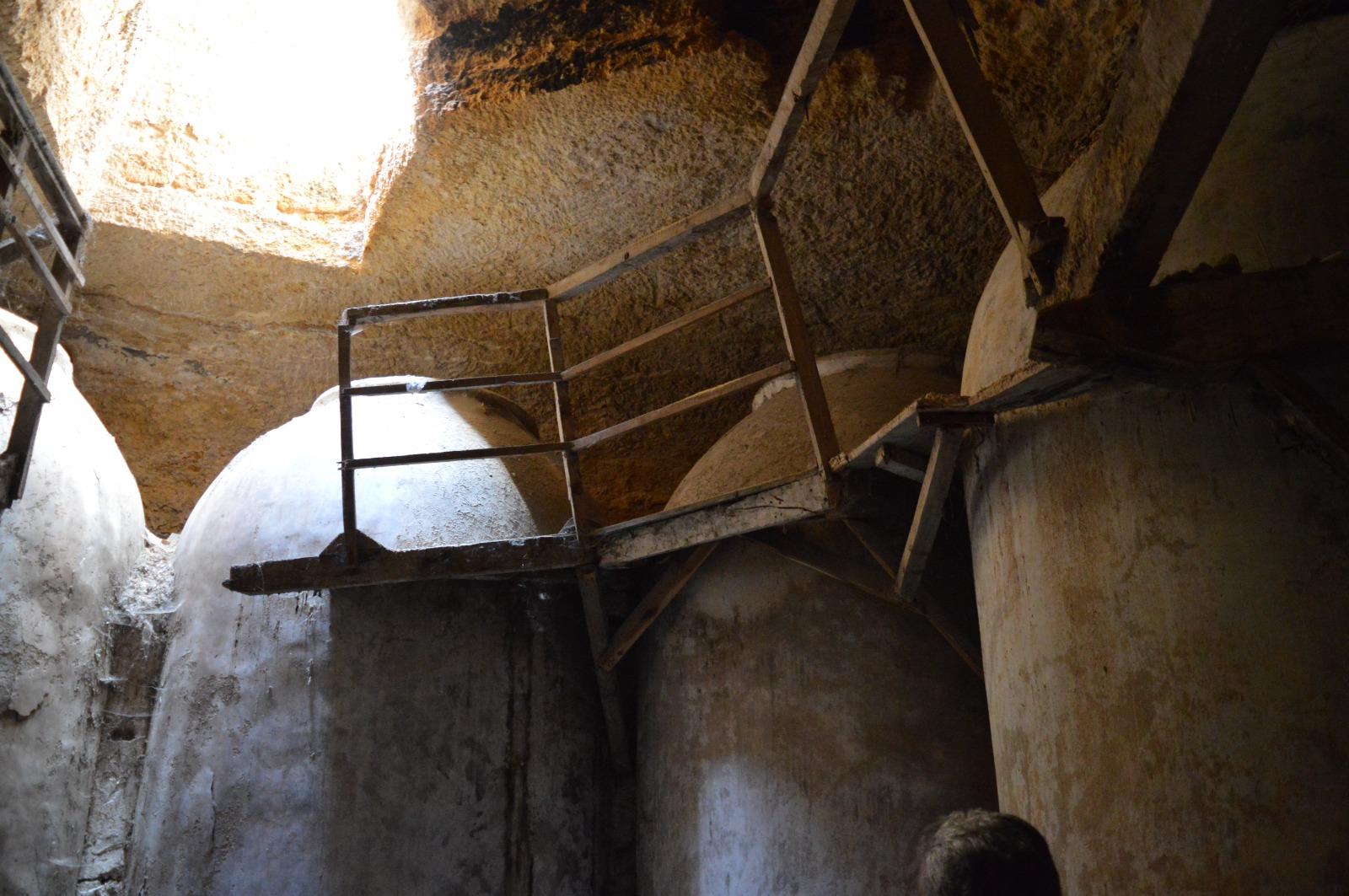 Continuamos bajando y llegamos a la cueva que alberga seis tinajas de cemento de unas 430 arrobas cada una y que, según explica nuestro experto José María Díaz, que nos acompaña, fueron de las primeras que se hicieron. La cueva, construida en torno al 1890, tuvo también tinajas de barro de pequeño tamaño. “A las de cemento todavía no les pasaban todavía la regla, solo la llana”. El empotre de madera es otro síntoma de la antigüedad de una cueva que está horadada por tres lumbreras, dos en el jaraíz y otra en la cueva con un desgarre muy estrecho. El techo aparece en la tosca y mezcla sus colores terrosos con el humo negro que desprendieron las lumbres hechas para combatir el tufo.
