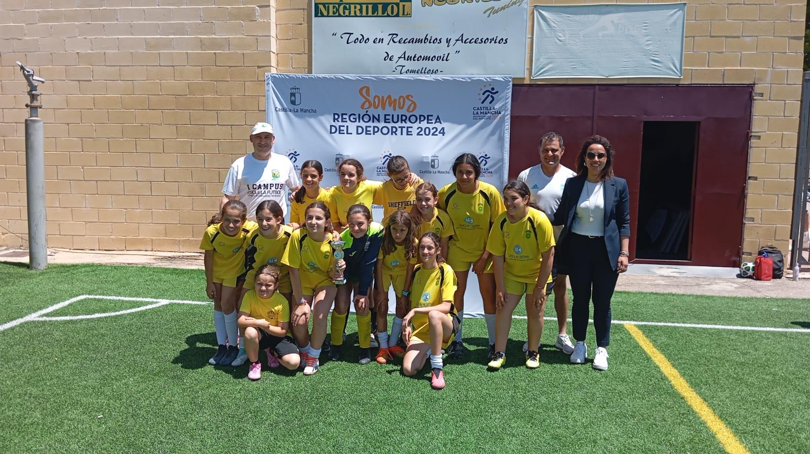El fútbol base femenino ha sido protagonista este sábado en Tomelloso con la celebración del I Torneo alevín femenino "Ciudad de Tomelloso" que ha reunido a once escuelas y numeroso público en los campos de la Ciudad Deportiva. Una intensa y calurosa mañana que ha culminado con la entrega de trofeos en los que ha estado presente el concejal del equipo de gobierno, Benito Benito Grueso; el responsable de Deportes de la Junta en Ciudad Real, Luis García Morato y la presidenta del club organizador, el Unión Tomelloso, Ana Palacios.