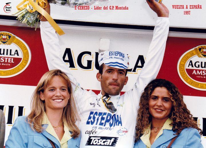 Francisco Javier Cerezo es historia viva del ciclismo. El tomellosero se ganó a pulso su llegada al profesionalismo en los años noventa y, aunque fue casi siempre un abnegado hombre de equipo que trabajaba para sus jefes de filas, consiguió cosas importantes. Fueron once años de entrega y profesionalidad que no pasaron inadvertidas para reputados directores de equipo que siempre lo quisieron tener a su lado. En esta foto para el recuerdo les mostramos un dulce momento en su quinto año como profesional, en el que llegó a portar el maillot de líder de la Montaña en la Vuelta a España. Al final quedó en la posición 32º en la general final y corría con el Estepona. Cerezo ha corrido Vuelta, Tour y Giro, palabras mayores, se ha subido al podium en el Campeonato de España y estuvo en las clásicas más prestigiosas. Conviene recordarlo porque lo que hizo Cerezo está al alcance de muy pocos.