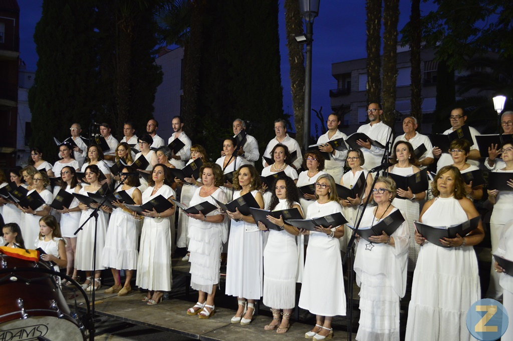 Con un llenazo en la Glorieta de María Cristina, la Coral Polifónica Lux Aeterna ha brillado y convencido este sábado en su III Concierto de Verano. Bajo la dirección de Antonio Javier Rodrigo, sus casi cincuenta componentes han ofrecido un variado repertorio con temas de diversos estilos y épocas que el público ha premiado con largas ovaciones en una agradable noche. Al éxito ha ayudado la participación de la Banda de Música de la Asociación Santa Cecilia que dirige Marta Baños y que siempre aporta empaque y calidad al espectáculo. Como han anticipado los presentadores, que han detallado la trayectoria de las dos agrupaciones, “ha sido una velada mágica, llena de emoción”. Ha asistido el alcalde, Javier Navarro y las concejalas de Cultura y Servicios Sociales, Inés Losa y Elena Villahermosa.