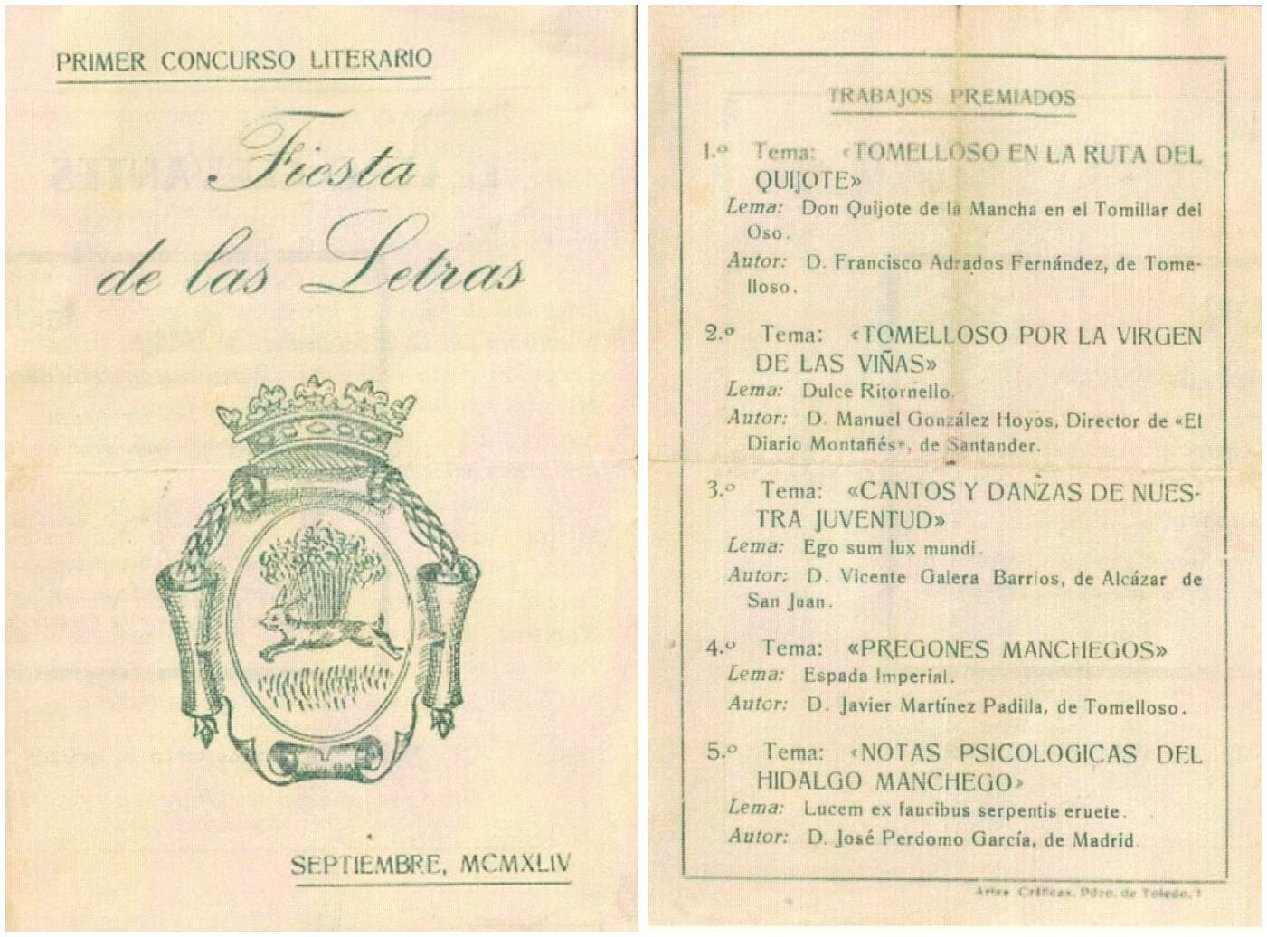 En el palmarés de aquella originaria edición hay dos conocidos periodistas de Tomelloso. El primer premio, en prosa, fue para Francisco Adrados Fernández, que en 1946 fundaría “Albores de Espíritu”. Ganó con el trabajo titulado “Tomelloso en la ruta del Quijote”. Javier Martínez de Padilla, periodista internacional y descendiente de El Obrero, logró el cuarto premio con el poema “Pregones manchegos”. Completaban el cuadro de honor, el director de El Diario Montañés, Manuel González de Hoyos; el poeta de Alcázar, Vicente Galera y José Perdomo García, seudónimo con El Obrero se presentó al Certamen.
