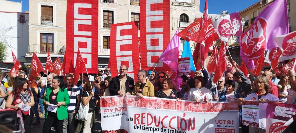 Comisiones Obreras y UGT se han concentrado este jueves frente a las sedes de las patronales en las cinco capitales de provincia de Castilla-La Mancha, -y en el conjunto del país-, para exigir la reducción de la jornada laboral a las 37,5 horas, una necesidad, una cuestión de justicia social y un mecanismo de solidaridad.