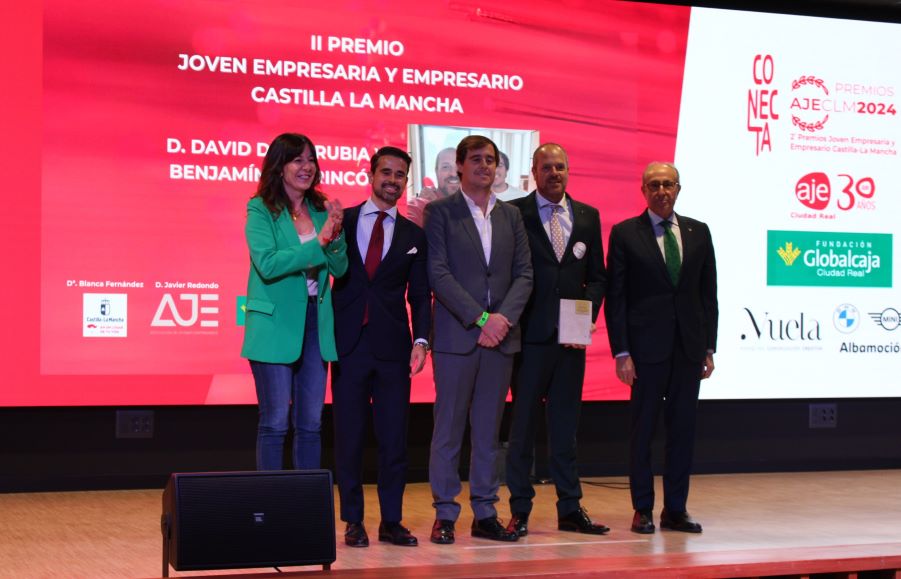 Precisamente, la delegada ha hecho entrega del Premio AJE al Joven Empresario de Castilla-La Mancha a David de la Rubia y Benjamín del Rincón, de la empresa DL2, a quienes ha felicitado junto al resto de empresas premiadas: ID Energy Group, Cremacuadrado, Finca Carril Cruzado, Mobhu, SC Plamave y a Elena Garrido Nutrición Funcional.