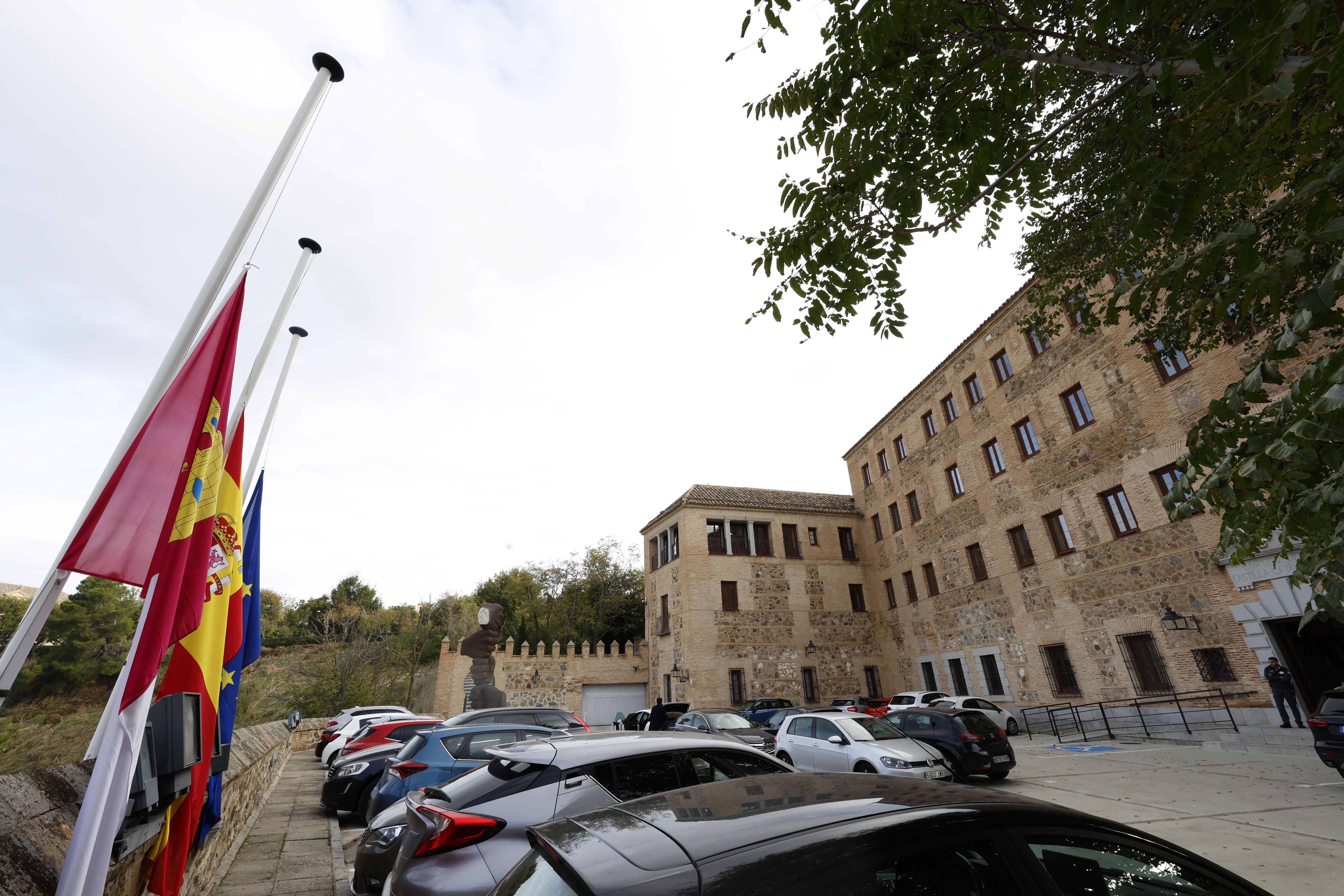 Las banderas oficiales de los exteriores de la sede de las Cortes regionales en el Convento de San Gil de Toledo ondean a media asta, sumándose así al decreto por parte de la Junta de Comunicades de tres días de luto oficial, como muestra de duelo y solidaridad.