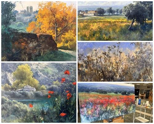 En el collage que les mostramos aparecen auténticas maravillas. En la parte superior izquierda aparece un precioso apunte de Alcázar y justo debajo, con unas amapolas en primer plano, aparece su trabajo sobre el Pantano de Viñuela. En la parte superior derecha vuelve a emocionarnos con la obra "Al llegar la primavera", un óleo sobre madera tratada con imprimaturas acrílicas. Un trabajo que quedó interrumpido por la pandemia y que acaba de terminar recientemente.