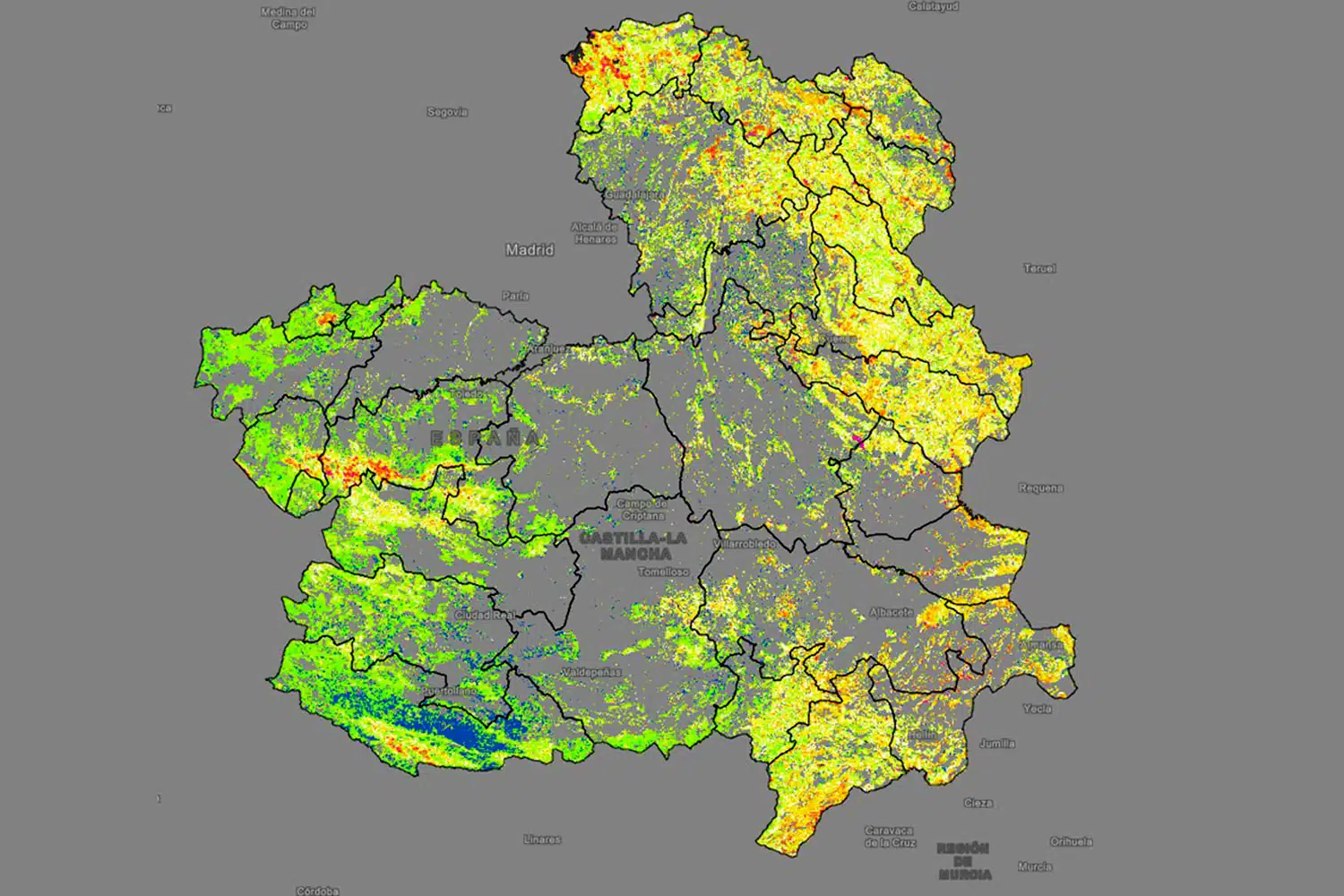 Gracias a las lluvias el “estrés hídrico” (parecido a la sequía) ha vuelto a niveles normales en prácticamente toda Castilla-La Mancha. Destaca el verdor de la mitad oeste por el crecimiento herbáceo, lo que significa que la vegetación está en nivel óptimo, según el plan Infocam de prevención y extinción de incendios forestales de Castilla-La Mancha.