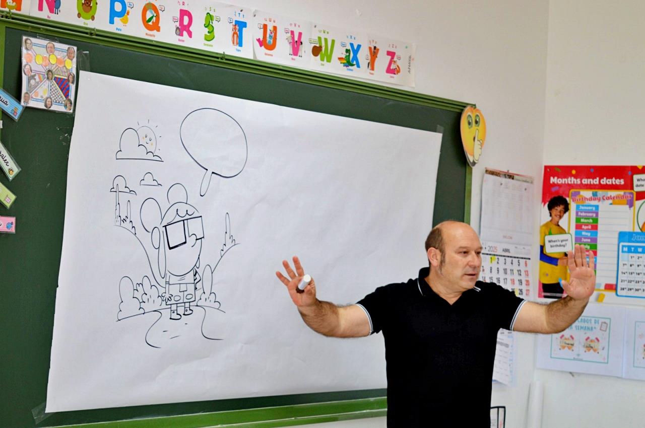Descrito por los propios niños y niñas como “dibujante, cuentista y tipo afable que llena de imágenes sus historias”, Alberto Díaz ha conectado con los más pequeños desde la cercanía y el entusiasmo, dejando huella en todas las etapas de Educación Primaria. En sus sesiones, ha abordado su trayectoria profesional —desde sus primeros trabajos con la editorial Anaya hasta sus actuales proyectos como Lechuza Detective y Carla y Lechuga—, mostrando el proceso creativo detrás de cada ilustración y animando al alumnado a crear sus propias historias ilustradas.