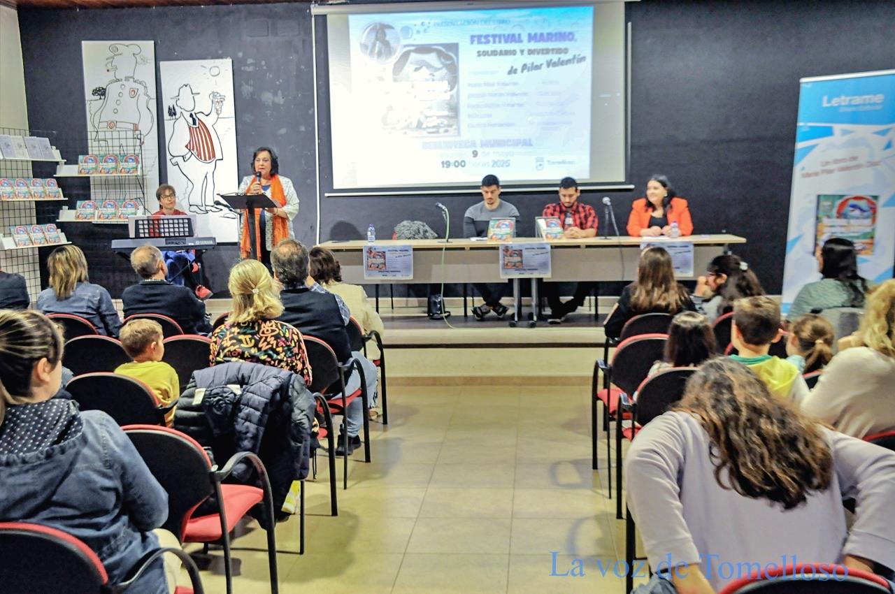 Con la canción “Háblame del mar marinero” de Pepa Flores —basada en un poema de Alberti— interpretada por Pilar Valentín y la pianista Beatriz Fernández, arrancó este viernes la presentación del nuevo libro de la autora, “Festival marino, solidario y divertido”. El salón de actos de la Biblioteca Municipal Francisco García Pavón ha acogido un evento vibrante, que ha presentado su directora, Carmen Labrador, lleno de emoción, literatura y compromiso. La presentación reunió a numerosos asistentes, miembros de la tertulia literaria La Media Fanega —que preside la autora—, antiguos alumnos, compañeros de profesión, un nutrido grupo de niños y niñas y la concejala Carmen López.
