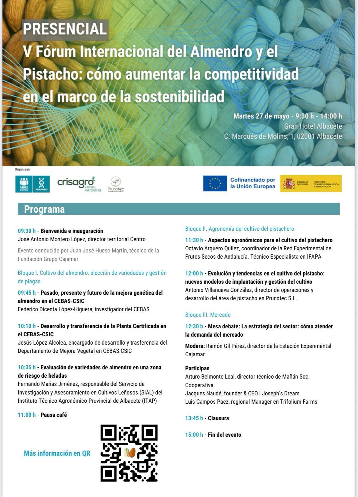Este año Albacete acogerá la quinta edición del Fórum Internacional del Almendro y el Pistacho organizado por la Fundación Grupo Cajamar, Crisagro y Prunotec que se celebrará el próximo 27 de mayo en la ciudad manchega.