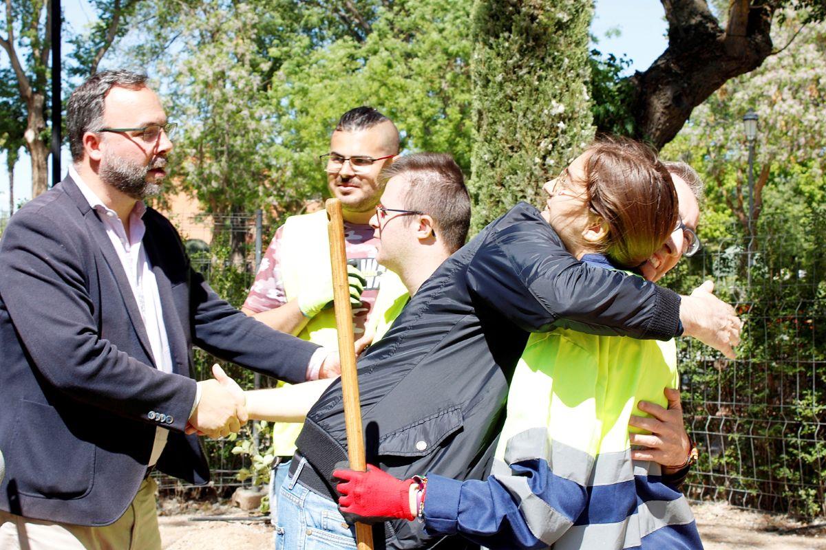 El alcalde de Tomelloso, Javier Navarro, ha visitado esta mañana el parque Embajadores para conocer de primera mano los trabajos que están realizando seis alumnos del colegio de educación especial Ponce de León, quienes se benefician de un convenio de prácticas firmado entre el Ayuntamiento y este centro educativo.