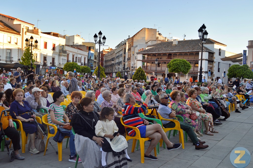 El primer grupo que subió a las tablas fue el grupo San Pantaleón, asociación joven que se afana en mantener vivo el folklore y las tradiciones de Porzuna y otros lugares cercanos de la provincia y región. Labriegas, Rondeña de Herencia, Los alhelíes, Fandango de Calzada, la Jota de San Carlos y un mayo fue el repertorio de un grupo integrado por personas de un amplio abanico de edades. Sus componentes conectaron con un público que premió su actuación, así como un rico vestuario en tonos claros que llamó poderosamente la atención.