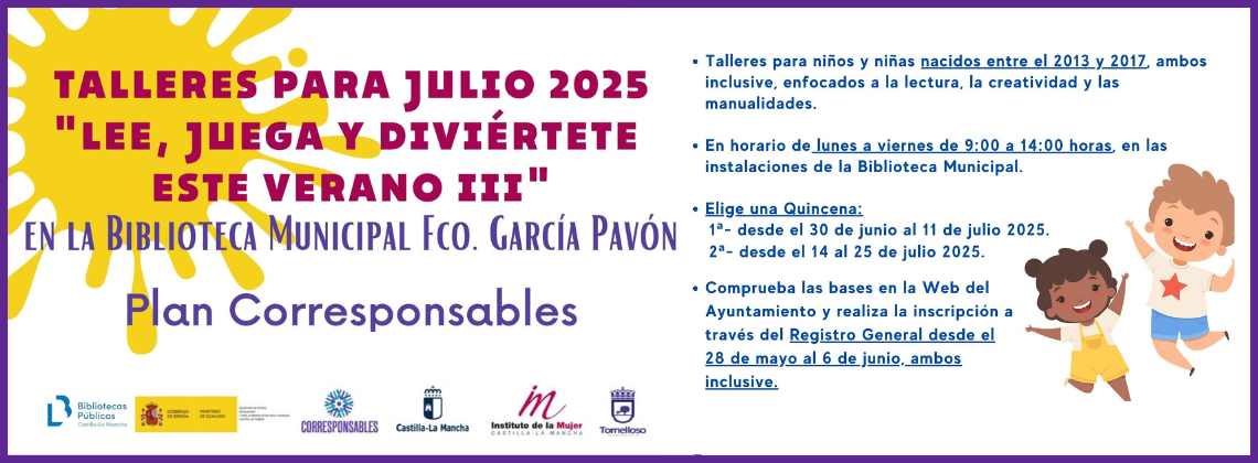 La Biblioteca vuelve a organizar su Taller "Lee, juega y diviértete III" para los pequeños y pequeñas de la casa, enmarcado dentro del Plan Corresponsables, y orientado a facilitar recursos para la conciliación de la vida laboral, familiar y personal. El taller se centra en desarrollar la creatividad, el gusto por la lectura, y disfrutar con diversas manualidades y juegos. Los beneficiarios y beneficiarias podrán ser niños y niñas nacidos entre los años 2013 y 2017, ambos inclusive.