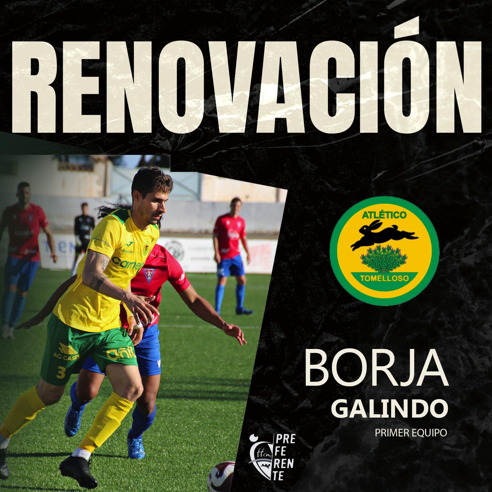Borja Galindo continuará una temporada más en el Atlético Tomelloso. El jugador criado en la cantera tomellosera llegó a mitad de temporada y ha sido indiscutible en la defensa. Ya fuera como eentral o lateral, siempre se mostró contundente en los duelos, rápido y agresivo en todas sus acciones. Ademas, siempre es aprovechable en las jugada de estrategia ofensiva como demostró marcando algunos goles. Su compenetración con otros zagueros del equipo: Carlos Berlanga, Izan o Yeisson fue perfecta.