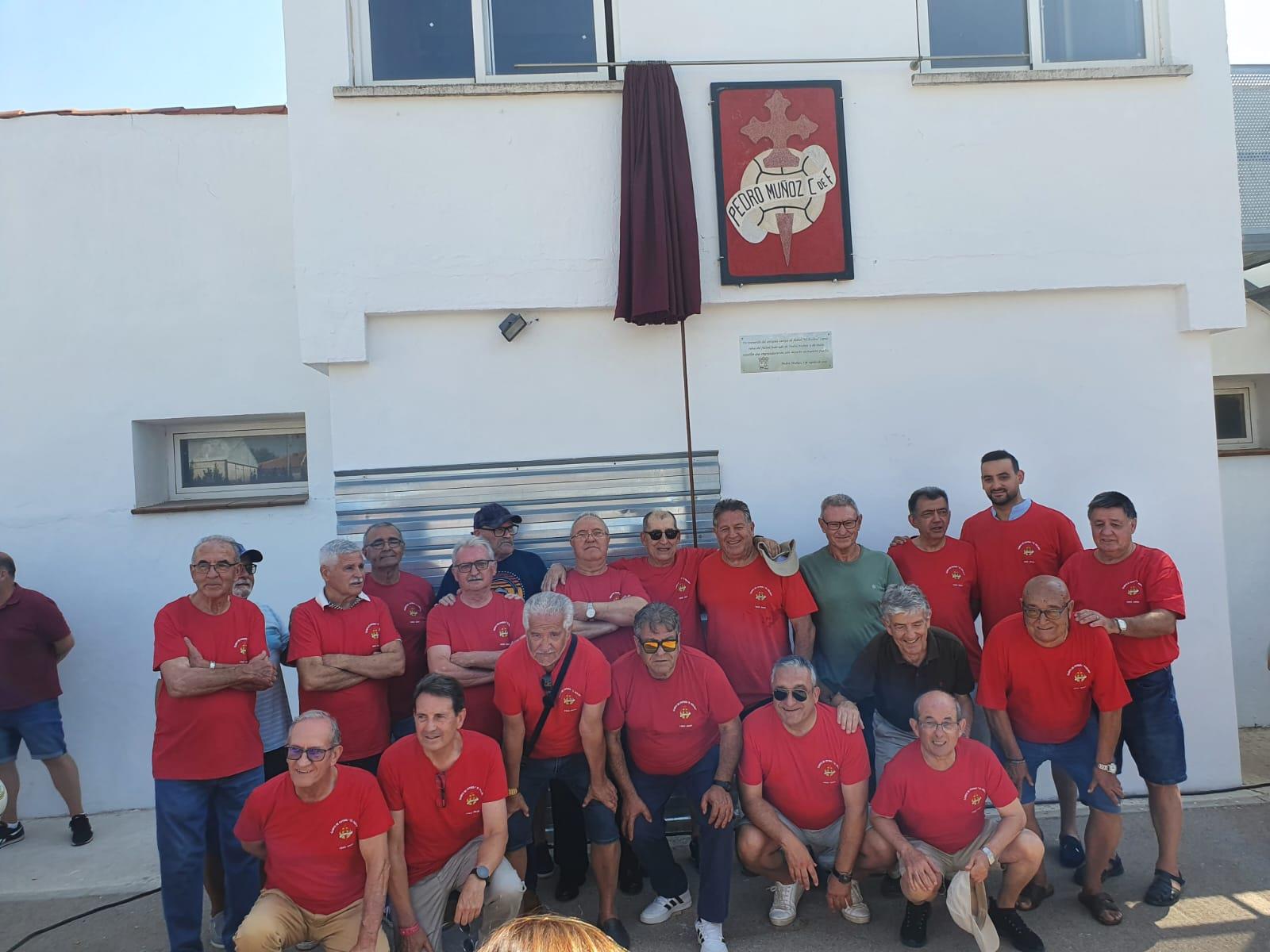 El pasado domingo 3 de agosto tuvo lugar en entrañable y emotivo acto en Pedro Muñoz. Jugadores de todas las épocas se reunieron para rendir homenaje al antiguo campo de fútbol, ese recinto en el que libraron tantas batallas futbolísticas y en el que se incubaron tantos recuerdos e ilusiones. Se descubrió una placa conmemorativa junto al Mercadillo Municipal y,, sin duda, la emoción presidió este encuentro en el que la gran mayoría de asistentes vistió la camisola roja del Atlético Pedro Muñoz. Alli estuvo nuestro compañero, Jesús García-Chicote, que también recordó sus buenos años futboleros y repitió una fotografía, muchos años después, con uno de sus compañeros. Un gran acierto que quede este vestigio del viejo campo de fútbol que ahora es un recinto multiusos que alberga actos de todo tipo.