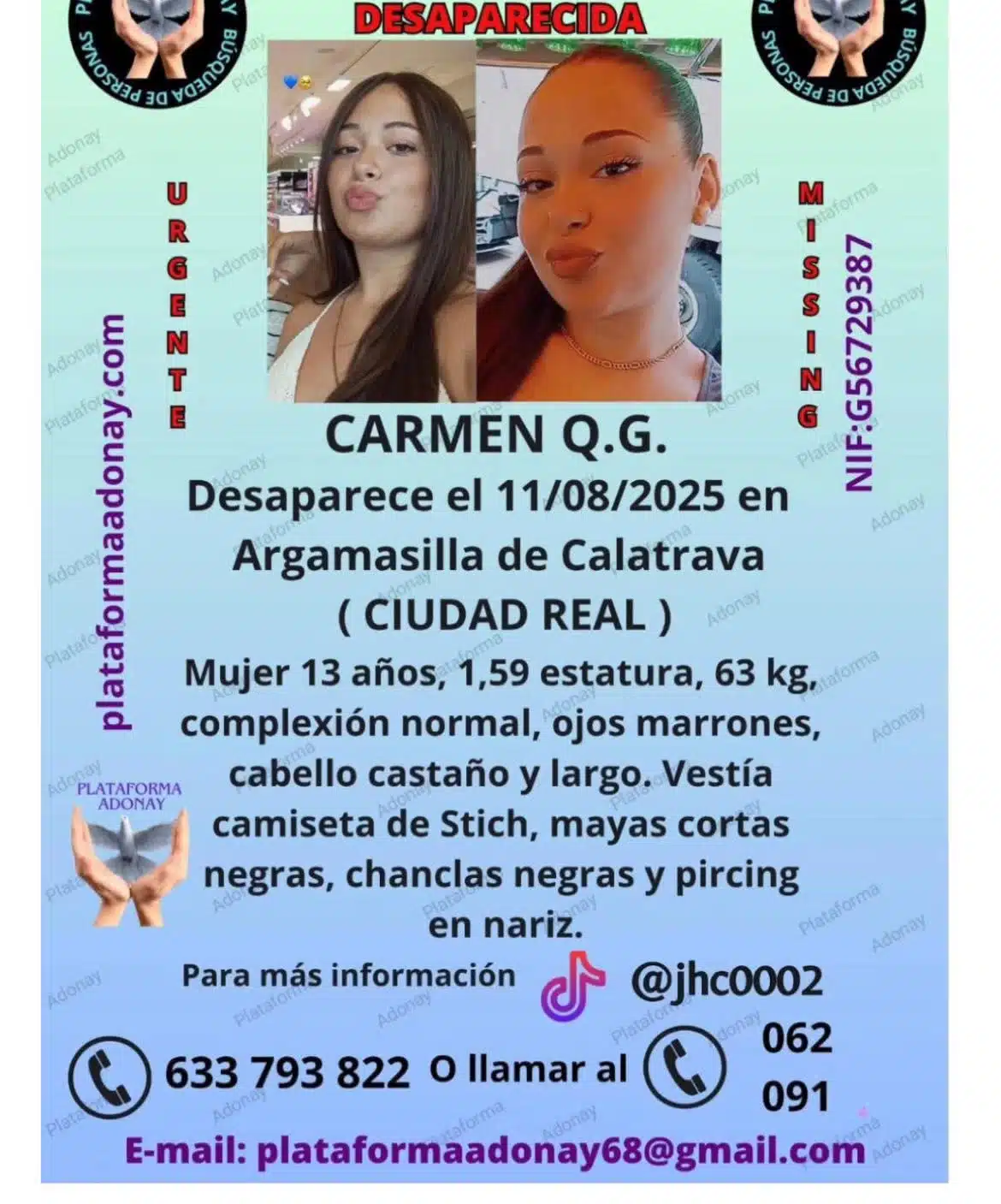 Carmen G. Q. es una menor, de 13 años de edad, que está siendo buscada por su familia. Se trata de una chica que ha desaparecido este lunes 11 de agosto en Argamasilla de Calatrava, de 13 años de edad, 1,59 de estatura y 63 kilos de peso. Tiene complexión normal, ojos marrones, cabello castaño y largo.