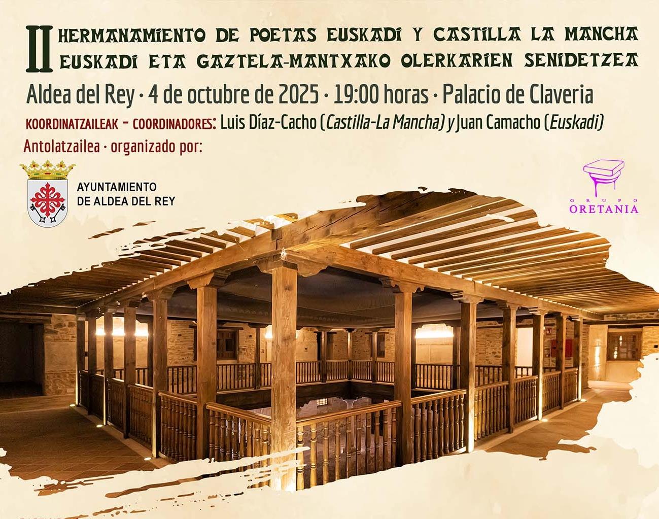 El sábado, 4 de octubre, a las 19:00 horas, en el Palacio de Clavería de Aldea del Rey, tendrá lugar la celebración del recital poético del ‘II Hermanamiento Oretania de Poetas de Euskadi y Castilla-La Mancha’, donde además de castellano y euskera, se recitarán poemas en catalán por Jesús Sánchez Riva, poeta catalán de origen manchego.