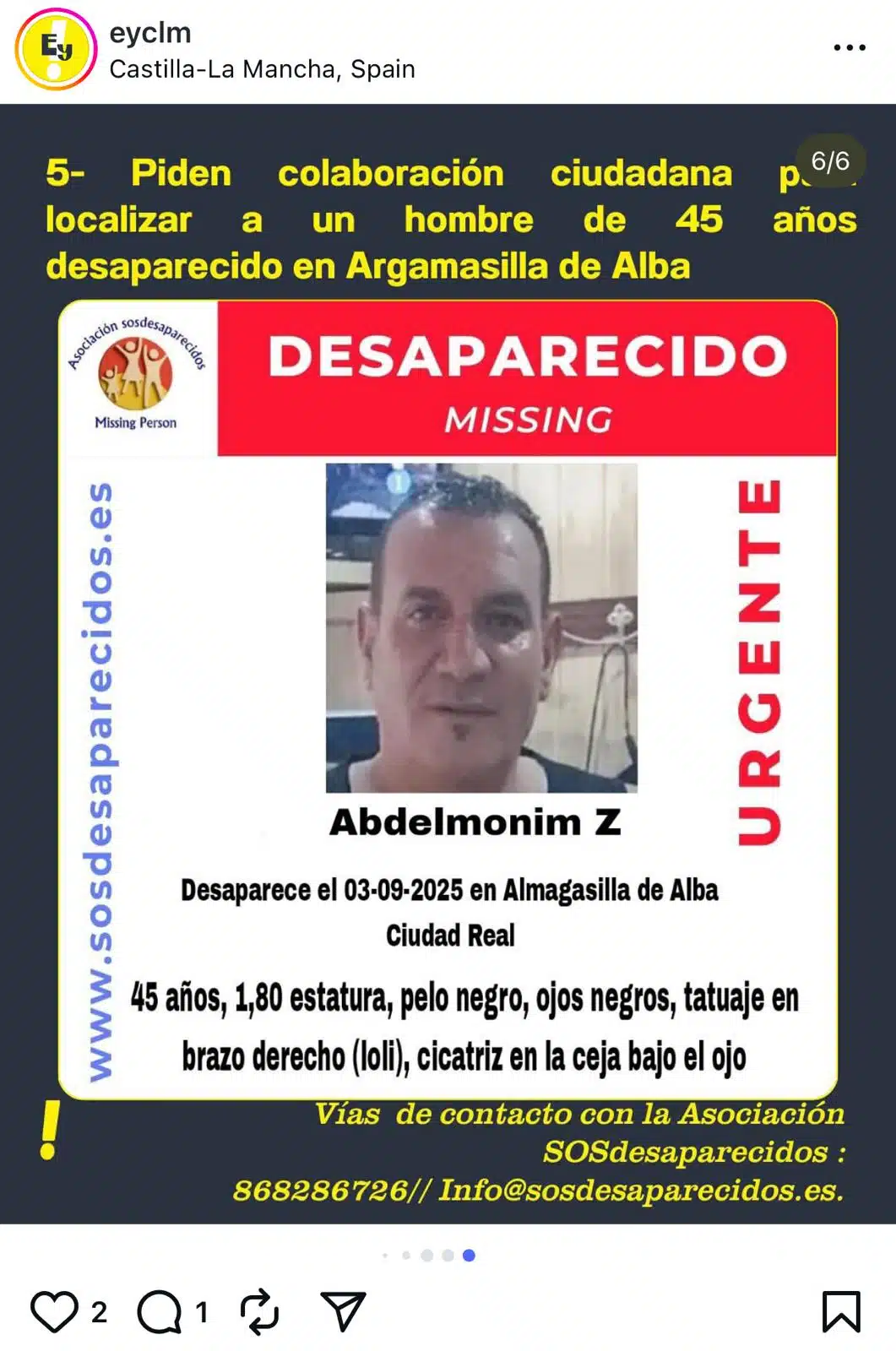 La Asociación SOS Desaparecidos ha pedido ayuda ciudadana para localizar a Abdelmonim, un hombre de 45 años desaparecido en Argamasilla de Alba. La alerta ha sido difundida en redes sociales tras estar varios días en paradero desconocido, junto con los datos físicos del hombre: mide 1,80 metros y tiene el pelo negro, los ojos negros, un tatuaje en el brazo derecho con la palabra ‘Loli’ y una cicatriz en la ceja.