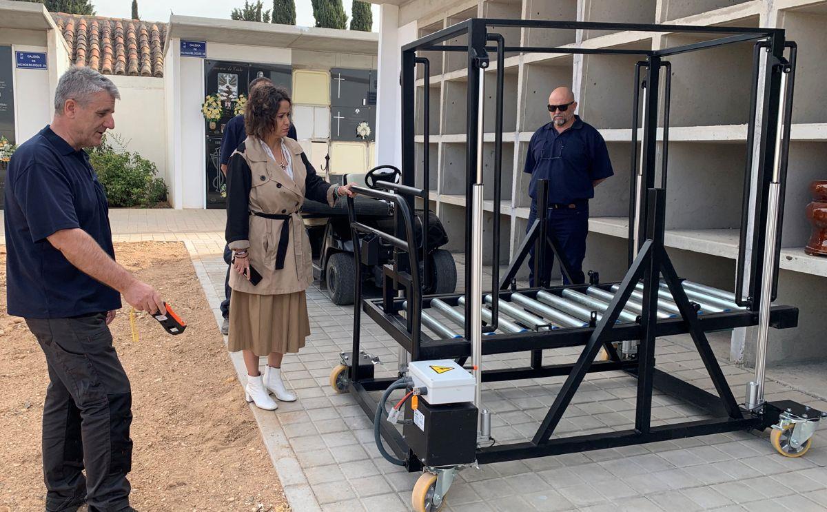 Con este “descensor”, se pretende, además de facilitar el trabajo del personal encargado de las inhumaciones, “optimizar los recursos del servicio e incidir en la aplicación de las medidas de prevención de riesgos laborales”, ha apuntado la concejala responsable del Cementerio, Carmen López, que ha comprobado sobre el terreno el funcionamiento de este nuevo mecanismo. Y sobre todo, ha explicado, permitirá que los féretros sean depositados en el interior del nicho de forma más segura, evitando una inapropiada manipulación del ataúd durante el transcurso de la inhumación.