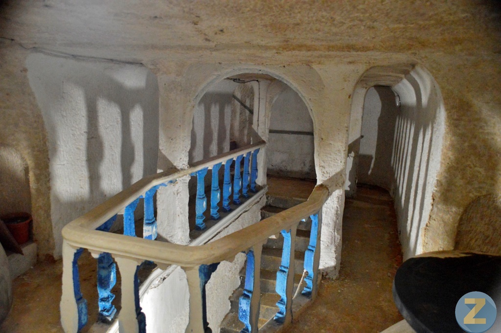 Un pasamanos ayuda nuestro traslado por la escalera que tiene un bonito arco de medio punto en su parte alta, pintado en tono albero.  Arriba nos espera Gabriel que pregunta a José María por la Asociación de Amigos de las Cuevas de Tomelloso que prosigue su labor de promoción de estas singulares construcciones.