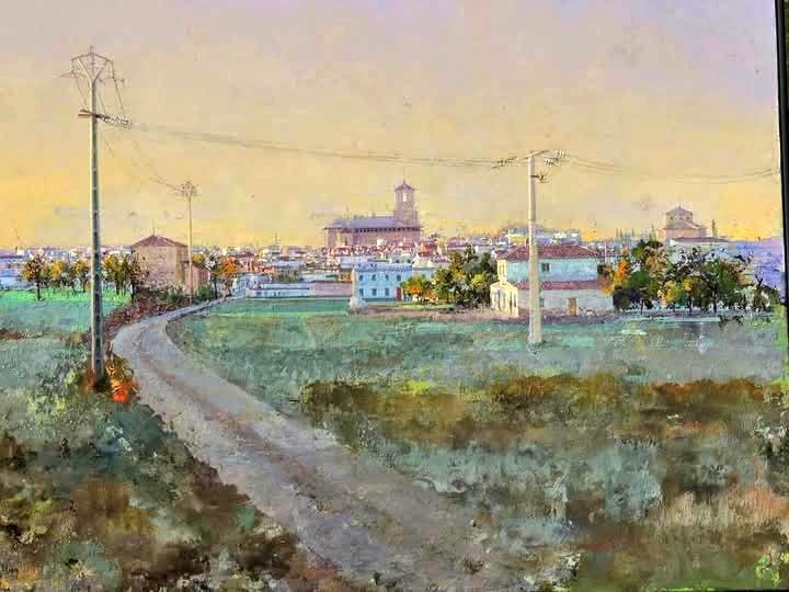 Nos enseña Ángel Pintado un maravilloso cuadro "Amanecer sobre Infantes", un óleo sobre lienzo donde el artista expresa su virtuosismo en el manejo del color, la fluidez de su pincelada y ese mágico uso de la luz que le permite atrapar una atmósfera lírica que emociona a la persona que observa el cuadro. Un bello realismo, con claro influjo de sus paisanos Antonio López y Francisco Carretero, que se muestra en toda su plenitud en esta maravillosa obra.