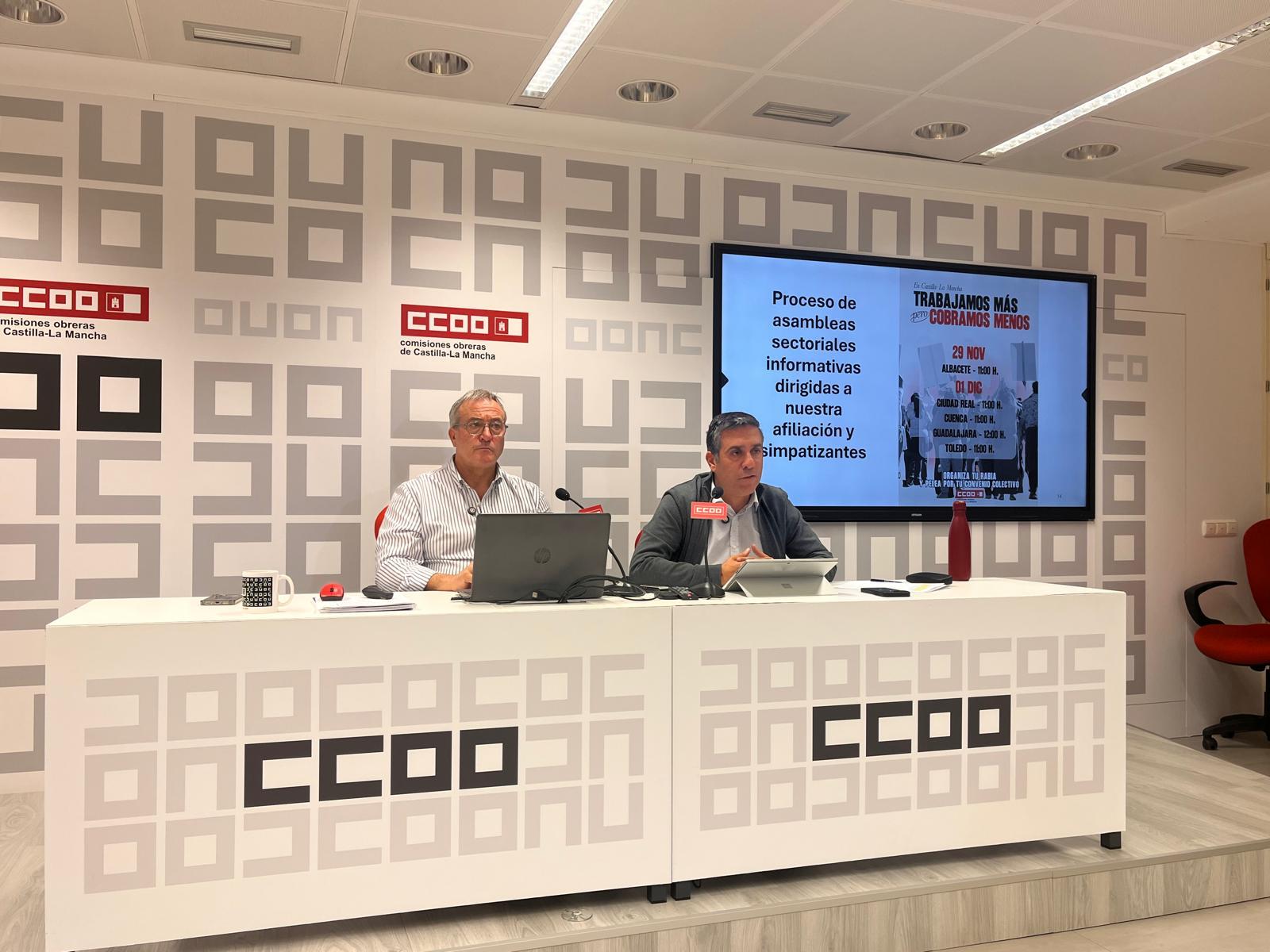 El secretario general de CCOO, Javier Ortega, y el secretario de acción sindical, Ángel León, han comparecido en rueda de prensa para explicar que el objetivo del sindicato es situar el convenio más importante de cada provincia como modelo para conseguir idénticas mejoras en el resto. Así se tomará de referencia en Albacete el convenio del metal, en Ciudad Real el del comercio general, en Cuenca el de la industria agroalimentaria, en Guadalajara el de logística y en Toledo el de la hostelería.