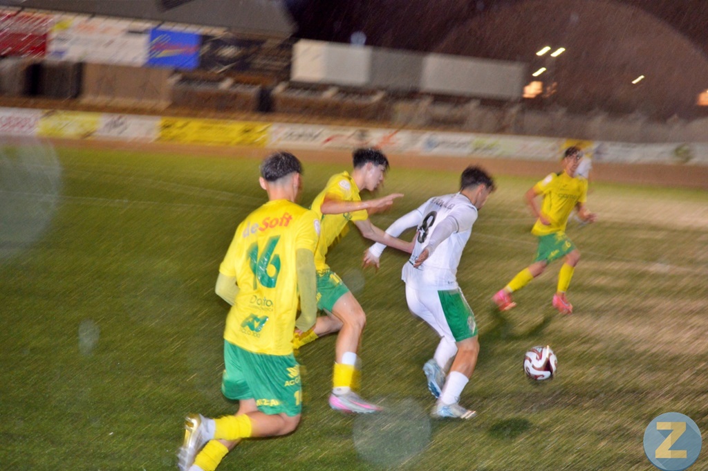 En el Paco Gálvez, con la lluvia haciendo acto de presencia casi todo el partido, más público que otros días y un pequeño apagón, el Atlético ha formado de salida con Martín Botija, Ballesteros, Jaime, Hugo, Guillermo, Escribano, Julio Zaragoza, Pablo Perales, Juanri, Juan José y Alonso. En el segundo tiempo han entrado Alberto Mateos, Àlvaro Román, Carlos Caro y Sergio Quirós.