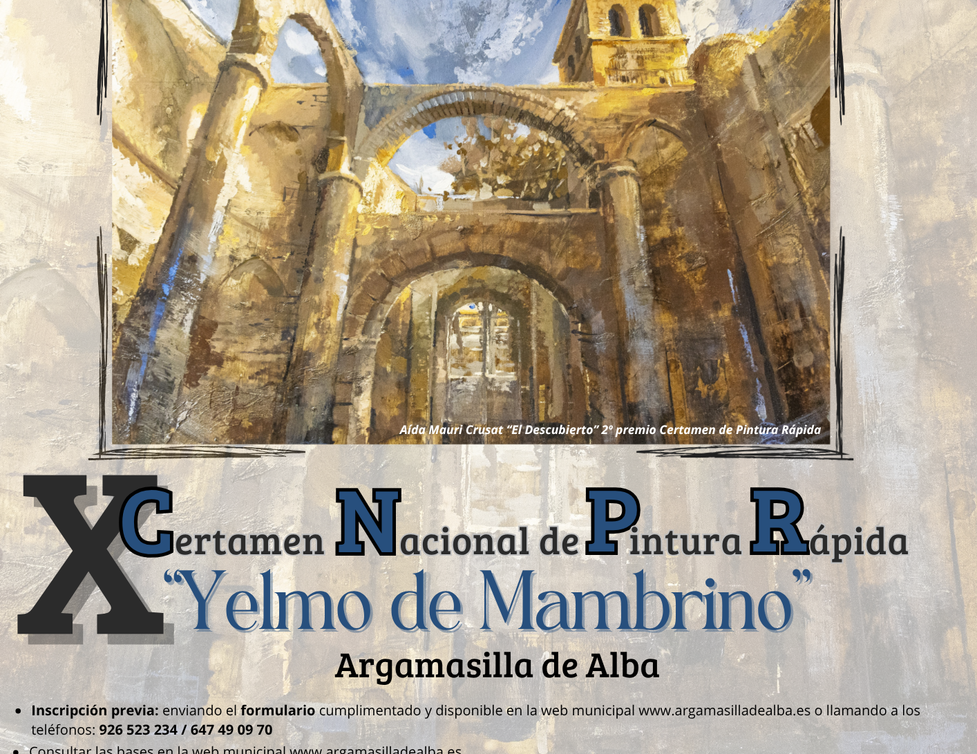 El Ayuntamiento de Argamasilla de Alba, a través de la Concejalía de Cultura, ha convocado el X Certamen Nacional de Pintura Rápida “Yelmo de Mambrino”, que se celebrará el 6 de junio de 2026 en el marco de la programación de las XXV Jornadas “El Quijote en la Calle”. El certamen tiene como finalidad fomentar la creación artística, así como contribuir a la promoción de la cultura y a la proyección de la imagen visual, estética, cultural y artística de Argamasilla de Alba, incentivando la participación de artistas y el acercamiento del arte a laciudadanía.